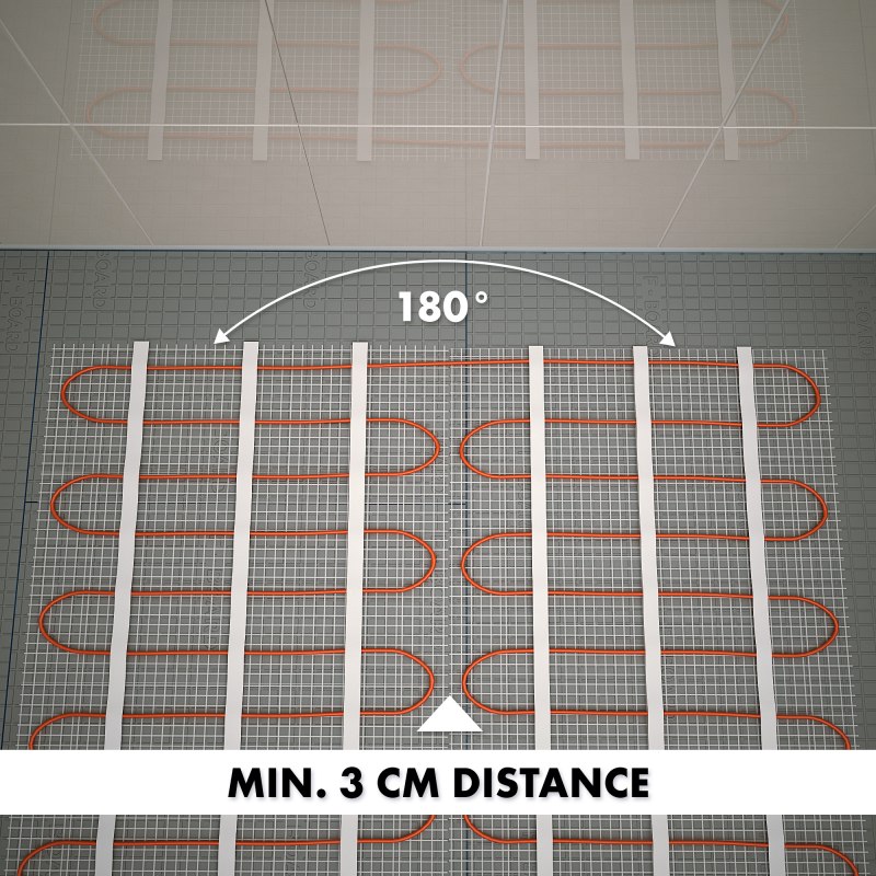 Eerst reken je het aantal te verwarmen vierkante meters uit in de ruimte, houd rekening met de breedte van de mat (50cm), zorg hierbij dat de vaste onderdelen in de ruimte niet meegenomen worden. Maak dan de ondergrond schoon, zodat er geen scherpe uitsteeksels liggen die de kabel kan beschadigen. Leg dan de mat uit hoe je dit uitgetekend had, zodat de kabels elkaar niet raken, dit kan namelijk oververhitting veroorzaken en zorg ervoor dat er minimaal 3 cm tussen de kabels zit en 3 cm van de rand van de muur ligt. Let op dat de oranje verwarmingskabel nooit mag worden ingekort, om de installatie passend te maken kan het gaas van de mat afgeknipt worden, houdt wel rekening met de minimale afstand tussen de kabels. Bij gebruik van een inbouwthermostaat moet de meegeleverde elektrabuis in de muur worden gefreesd om de koude zwarte kabel van het verwarmingssysteem en de vloersensor in weg te werken. Bij het gebruik van een opbouwthermostaat moet de koude zwarte kabel en de kabel van de vloersensor worden weggewerkt met een kabelstrip op de muur. Hierna kan de vloer geëgaliseerd worden en kan de tegelzetter aan de slag met het plaatsen van de tegels.